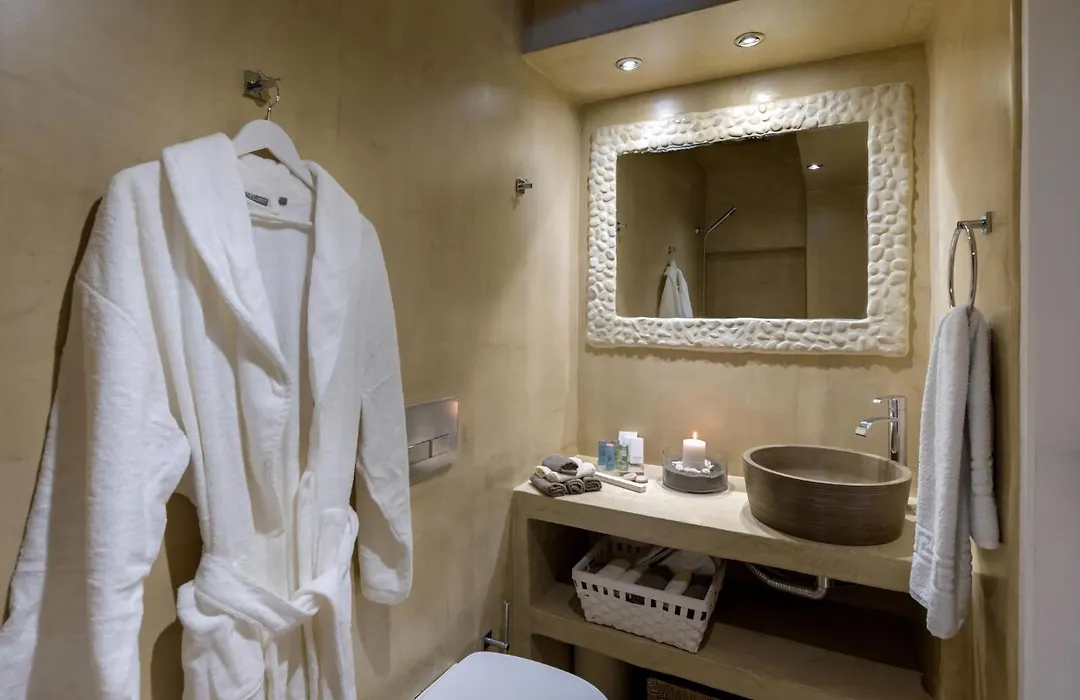 Το κατάλυμα έχει υπαίθρια τραπεζαρία με παροχές καφέ και τσαγιού, ψυγείο, μαγειρικά σκεύη για αυτοεξυπηρέτηση. Οι επισκέπτες μπορούν να γευματίσουν στο Laze, που βρίσκεται σε απόσταση μόνο 600 μέτρων. Το πλησιέστερο αεροδρόμιο είναι Κρατικός Σαντορίνης, που απέχει 15 χιλιόμετρα από αυτό το κατάλυμα. Οι επισκέπτες έχουν πρόσβαση στο τζακούζι για απόλυτη χαλάρωση και ξεκούραση. Εδώ οι επισκέπτες μπορούν να κάνουν πεζοπορία και ποδηλασία.